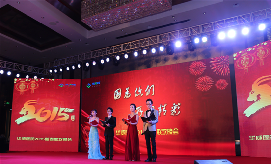 2015年2月8日,華威醫(yī)藥“因?yàn)槟銈?所以精彩”新春聯(lián)歡晚會(huì)在南京金奧費(fèi)爾蒙酒店隆重舉行。下午16點(diǎn)整,南京市棲霞區(qū)委領(lǐng)導(dǎo)、江蘇生命科技創(chuàng)新園管委會(huì)領(lǐng)導(dǎo)、江蘇高科技投資集團(tuán)領(lǐng)導(dǎo)、禮來(lái)亞洲基金領(lǐng)導(dǎo)及華威醫(yī)藥全體同仁共250余位嘉賓出席華威醫(yī)藥年度盛宴。在晚會(huì)主持人的新春祝福聲中,與會(huì)嘉賓共同觀看了“我們的2014”開場(chǎng)視頻,共同分享和回顧了華威醫(yī)藥2014年度在各方面取得的優(yōu)異成績(jī)和精彩瞬間。